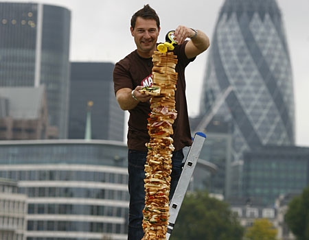 8. George Lambert from Hackney was the first marmite sarniologist. He made a 12 ft tall stack containing 500 slices of bread, 20 lettuces, 65 tomatoes, 30 bananas, 25 carrots,1500g of cheese and, of an unstated quantity of Squeezy Marmite in 2008.