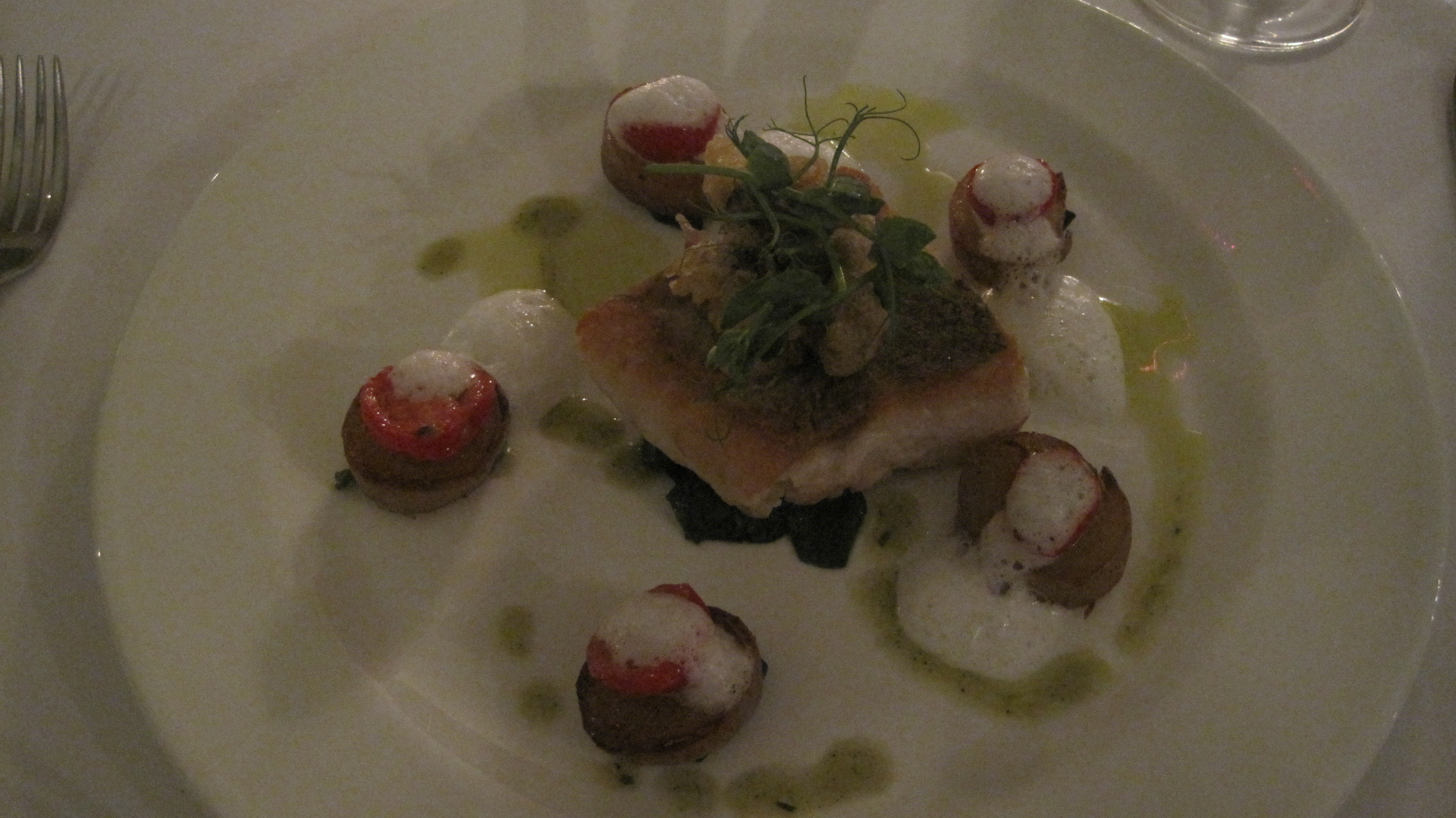We begin with melt-in-your mouth scallops atop soft potato fondants, crowned with crispy pancetta and served with brushstrokes of chervil puree on a slate board that looks like something you’d find in the Tate Modern.